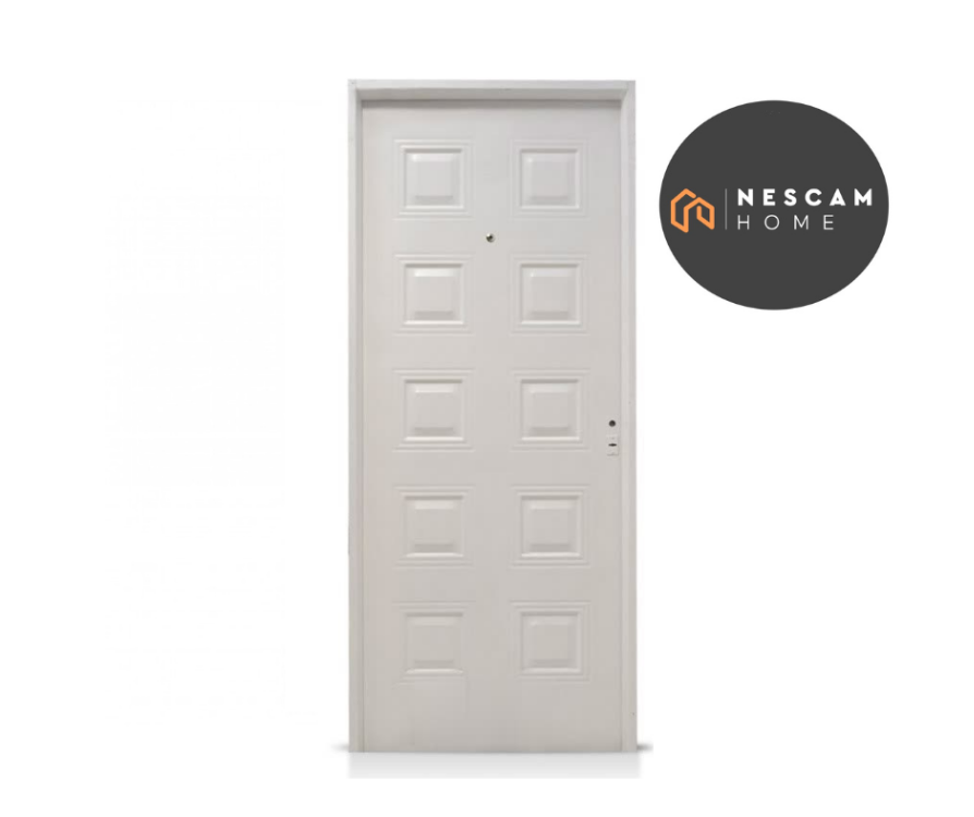 PUERTA EXTERIOR LINEA SIMPLE ESTAMPADA REFORZADA MEDIDA DE PASO: 80 X 200 CMS MEDIDA DE AFUERA-AFUERA: 86 X 205 CMS ANCHO DE MARCO: 8.0 CMS CERRADURA DOBLE PALETA BISABRAS DE PERNO PINTURA ANTIOXIDO BLANCA DE PRESENTACION